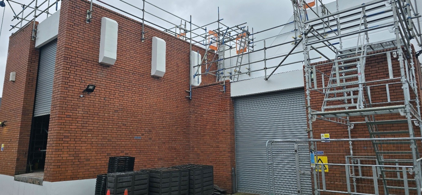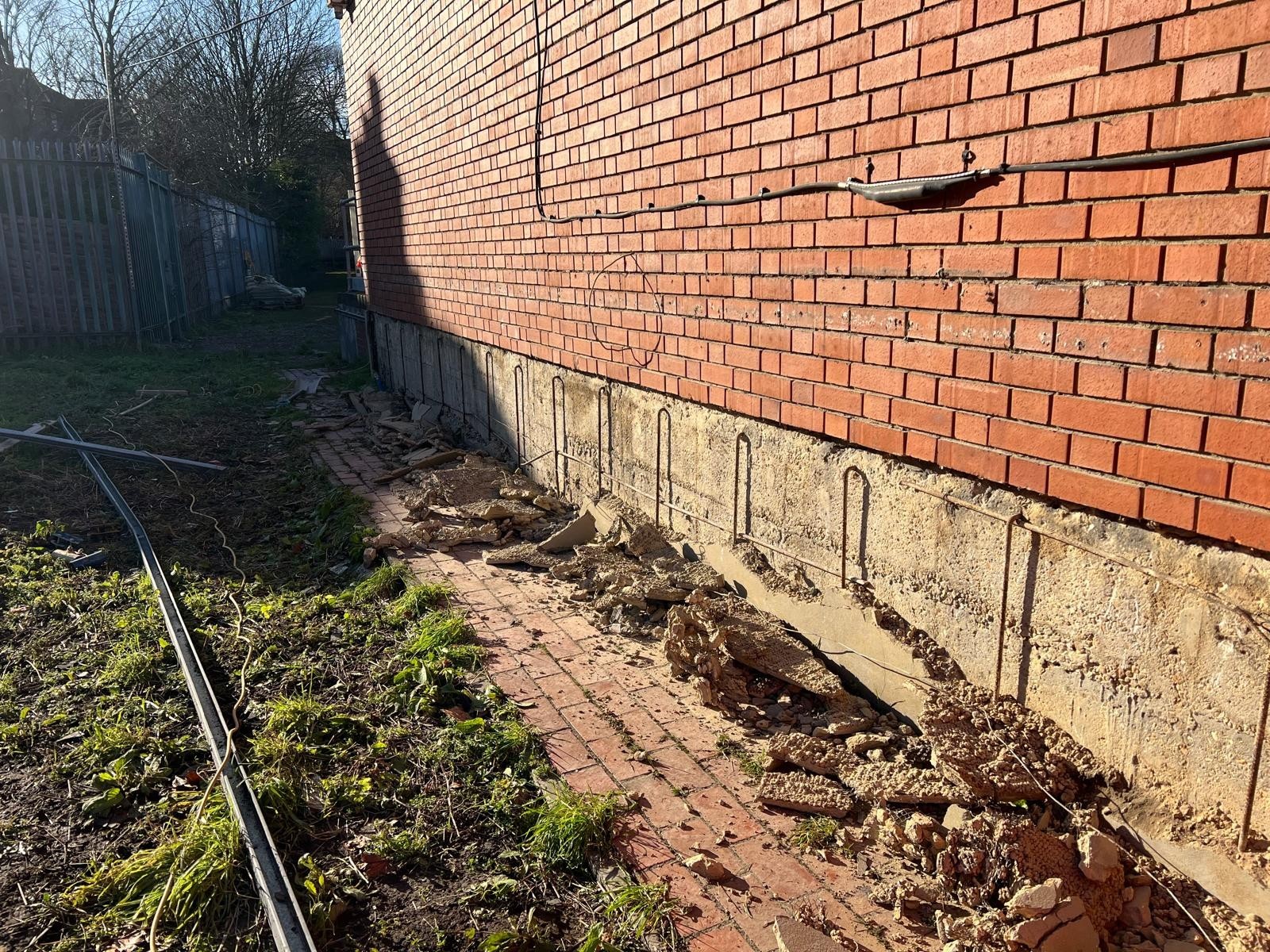 The structure forming the focus of the works is a single-storey reinforced concrete framed building, constructed with in-situ cast reinforced concrete columns and beams supporting a ribbed reinforced concrete flat roof slab. The walls are formed in solid masonry, with exposed beam ends extending in cantilever at roof level.