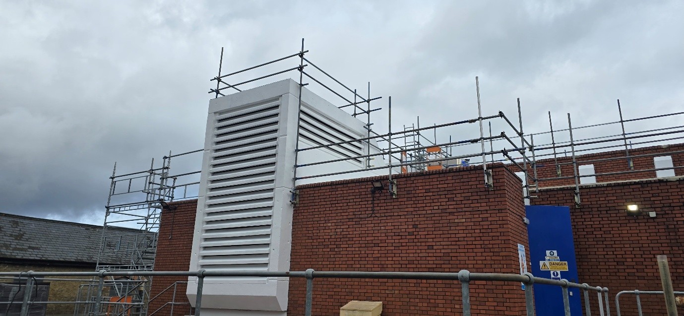 The central section of the pump house rises above the surrounding roof and incorporates a reinforced concrete louvre vent and roof monitor with single-glazed, metal-framed windows.